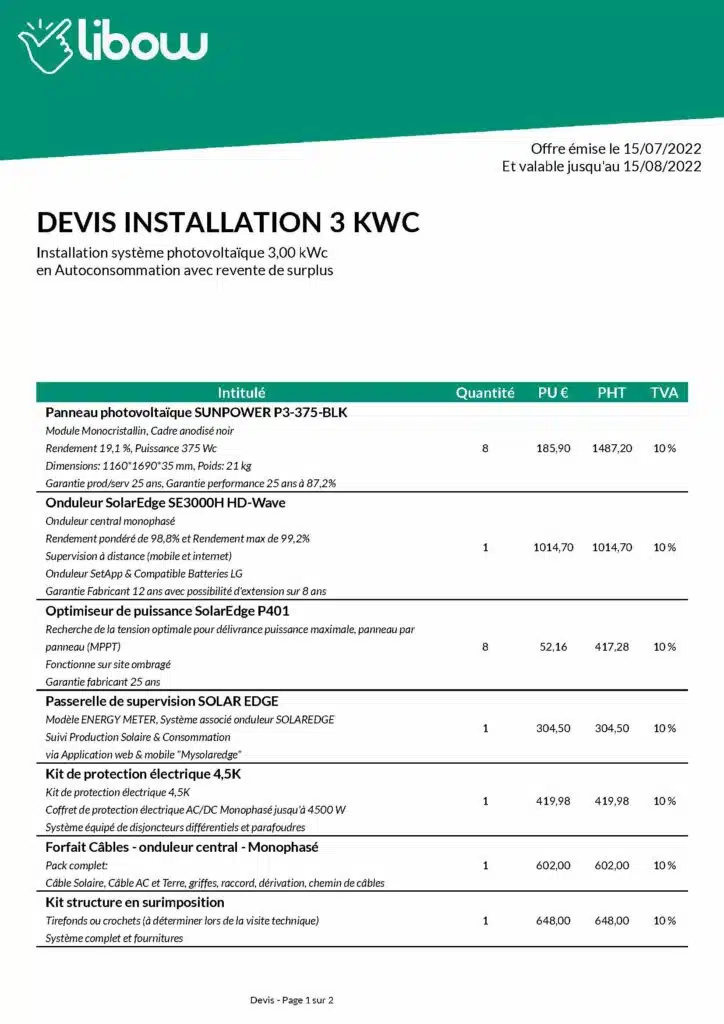 Exemple de devis pour une installation solaire de 3 kWc. Source : Libow copyright (données non exhaustives)