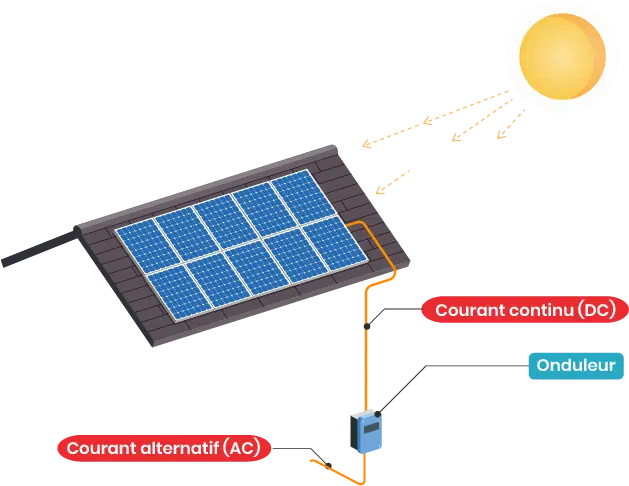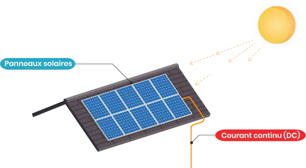 Le panneau solaire a pour fonction de transformer la lumière du soleil en énergie, et plus particulièrement en courant continu (DC). Cette conversion s’exprime en taux de rendement : un rendement de 18 % pour un module photovoltaïque signifie que 18 % de la lumière captée est convertie en électricité.