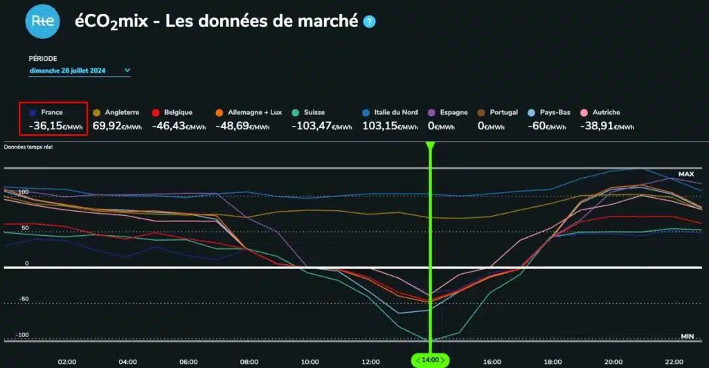 Cet été, par exemple, les prix de l’électricité sont devenus… négatifs : -36,15 € le MWh le 28 juillet et -21,92 € le 10 août à 14h. Oui, vous avez bien lu : nous avons payé pour que d’autres utilisent notre électricité :