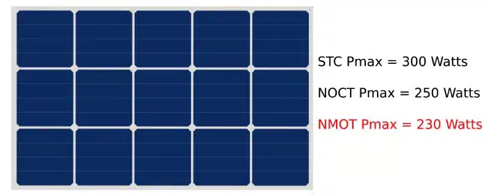 Les conditions NOCT stipulent une irradiance de 800 watts par mètre carré, une température ambiante de 20 degrés Celsius, une vitesse du vent de 1 mètre par seconde et une température des cellules solaires de 25 degrés Celsius. Ces conditions sont donc plus proches des conditions réelles (pour les pays du nord) et fournissent une meilleure indication de la performance qu’un panneau solaire pourrait avoir sur le terrain.