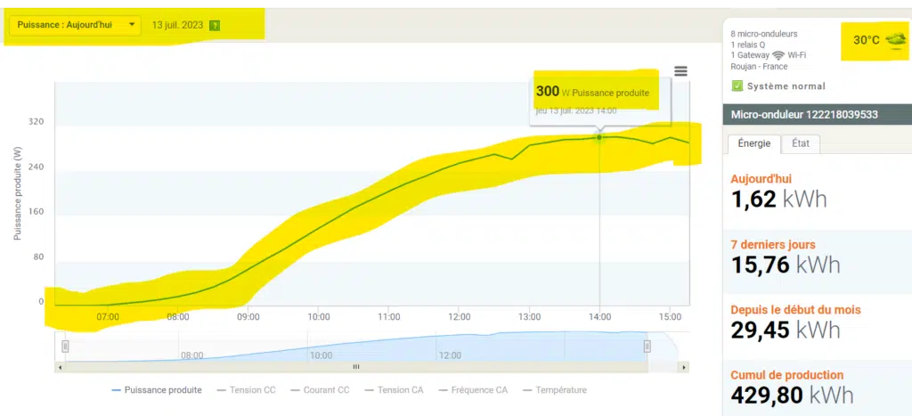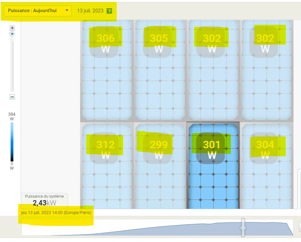 soit une puissance réelle attendue qui devrait être de 19.54% inférieure à 375 W soit 302 W par module et 2.42 kW pour toute l’installation. Qu’en est-il en réalité ?