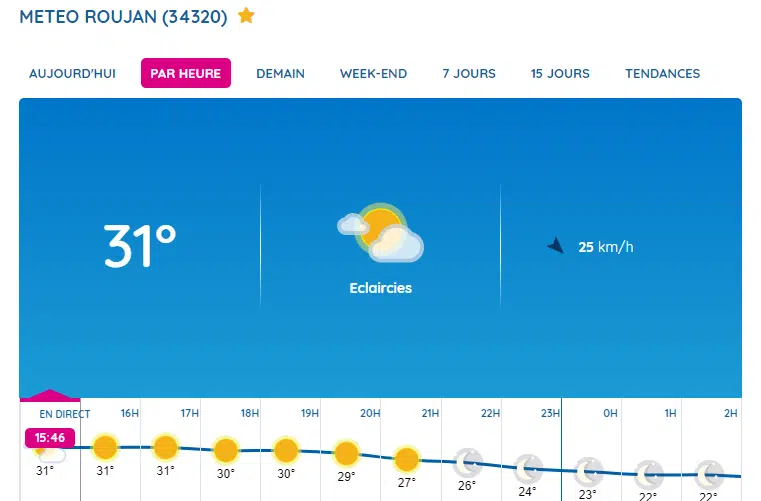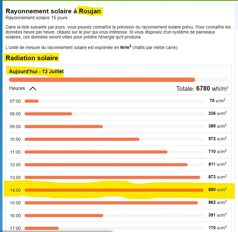 Les condition réelles le 13/07/2023 à 14h00 à ROUJAN (3420) sont une température de 31°C (soit +6°C que la norme STC) et une irradiation de 890W/m2 (soit -11%que la norme STC).